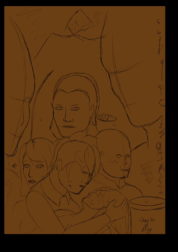 Right! Here is a more complete version of the sketch from day 31. Its more or less what I was trying to do then, slightly reimagined due to mashing several files together. Click the image for a bigger version if you want to see the angry lady in more detail cos she took quite a while, nearly went HIDEOUSLY wrong and I juuuust managed to pull it back and in the thumbnail it looks like i coulda spent 2 seconds on her. :) Also theres some critical comments about her proportions.