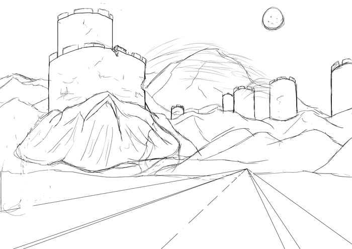 First practice draft for a landscape painting. Pretty darn tired though so I'm off to bed.