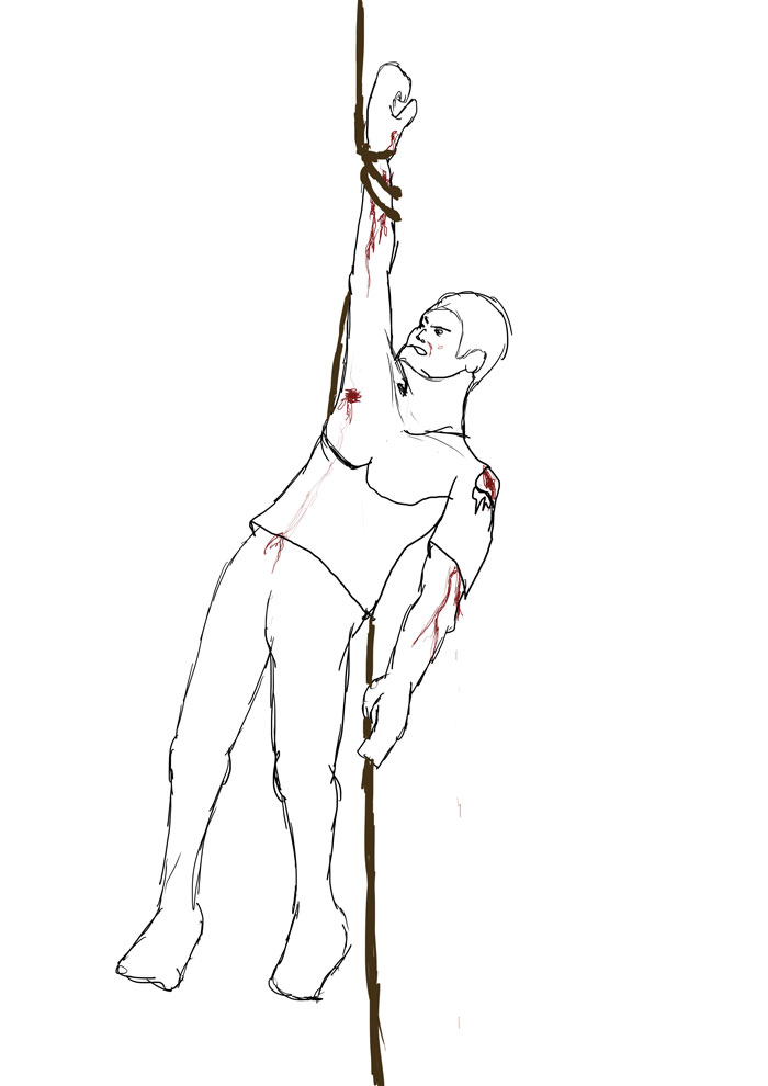 Guy snagged in a rope after a fall. Guess he's lucky he got caught but it musta really HURT! Anyways hope you like it.