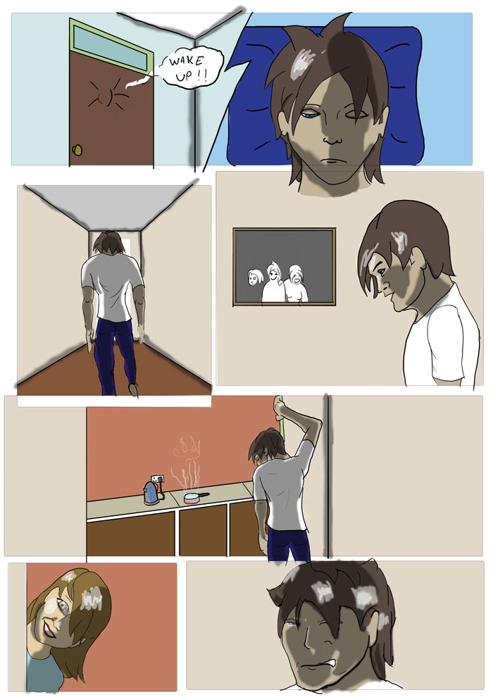 Panel 1 - A teenage boy is lying in bed asleep, streaks of light playing across his face from the poorly closed blinds.